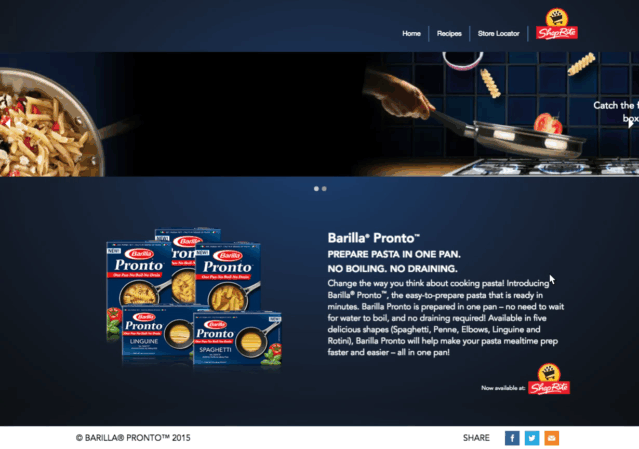 Microsite and game development for Barilla's new product line Barilla Pronto. This pong-style catching game tasks you with catching ingredients in a pan with a coupon for winning. The microsite houses the game as well as recipes that can be made with Barilla Pronto. This project was developed with a LAMP stack leveraging JS, HTML5, Wordpress, Foundation, Sass & Grunt.